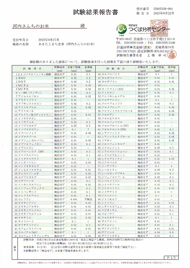 令和7年玄米の検査結果です