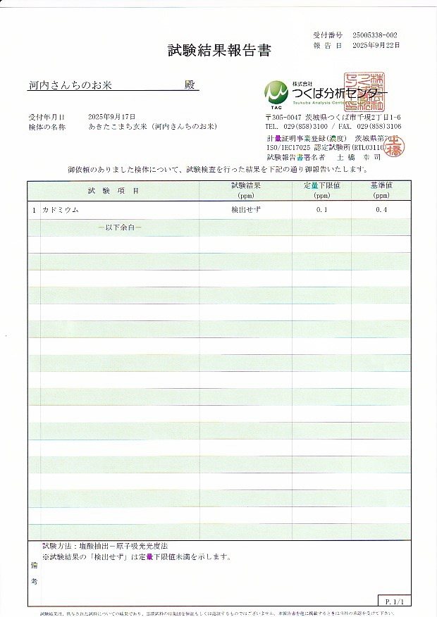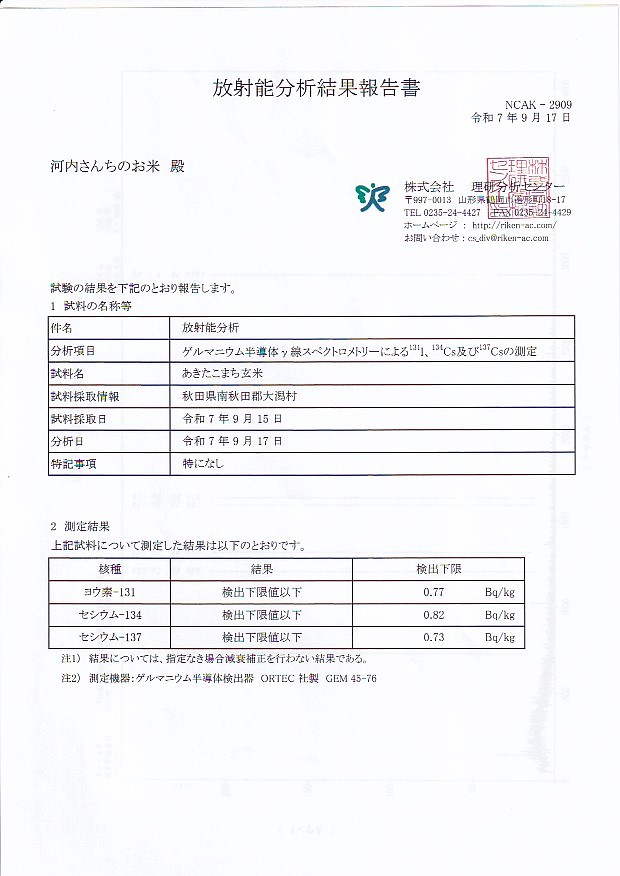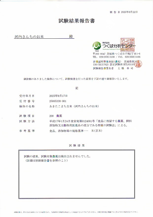 令和7年玄米の検査結果です